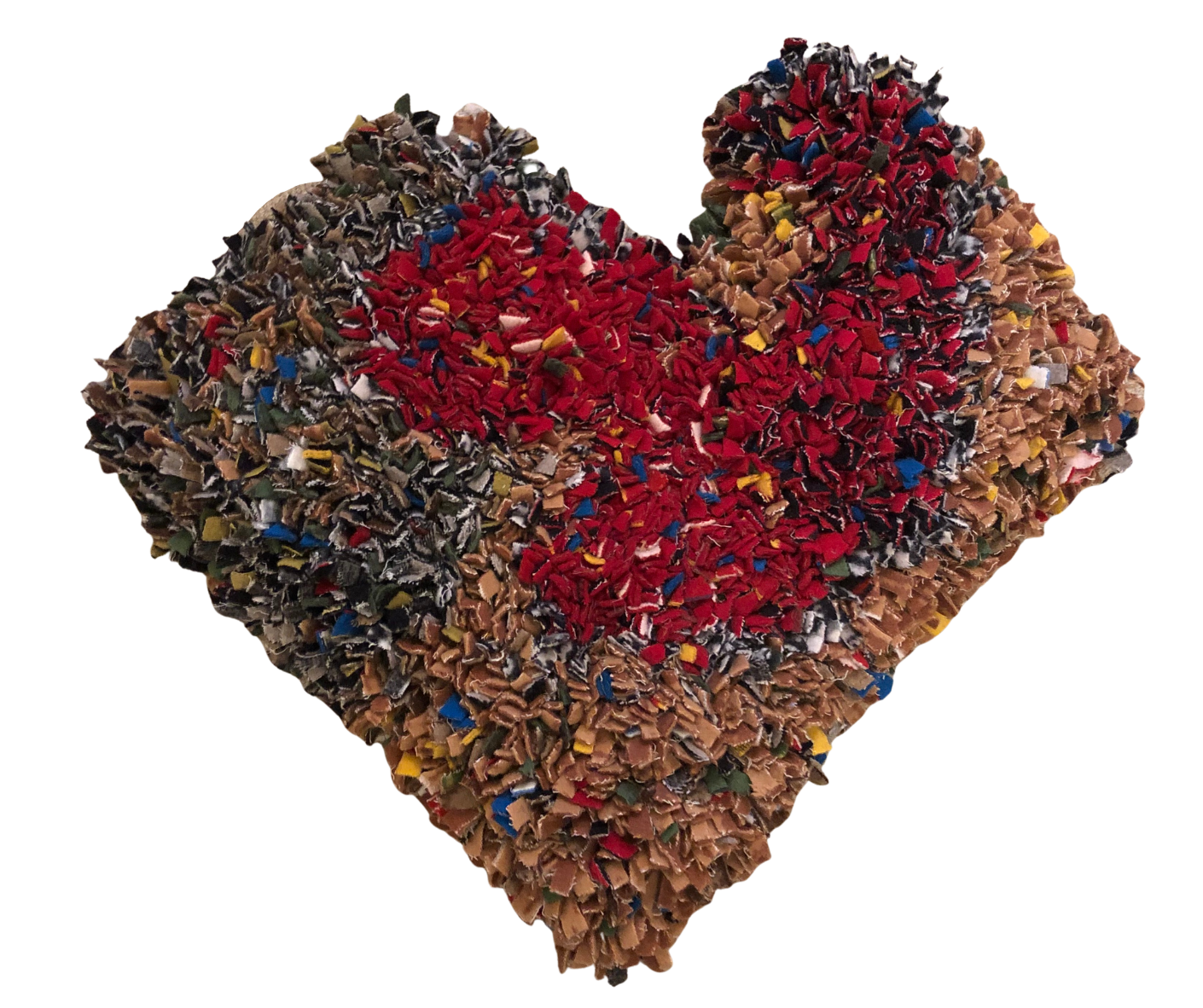 24” x 28”. Four months in the making from our wool remnants this lush, dense and earthy heart of fiber features a heart within a heart. $1200